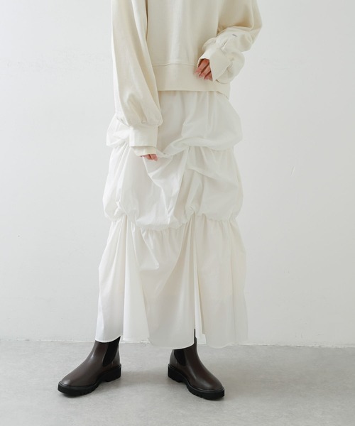 スタイリングの主役に抜擢! 〇差別化できるティアードバルーンデザイン 〇落ち感ある素材ですっきり 〇キレイめからカジュアルまで幅広く着こなせるデザイン styling コーデの主役間違いなし!バルーンシルエットとティアードデザインをミックスし、他にない一枚で様になるデザインです◎落ち感ある素材でボリュームを抑えつつ、ウエストをキレイに魅せてくれるので、クロップド丈のスウェットでカジュアルダウンに着こなすのがおすすめ!甘めからキレイ目にも落とし込めるのでコーデの幅も広がります。 【2025 Spring/Summer】【25SS】 ※商品画像は、光の当たり具合やパソコンなどの閲覧環境により、実際の色味と異なって見える場合がございます。予めご了承ください。 ※商品の色味の目安は、商品単体の画像をご参照ください。 ▼お気に入り登録のおすすめ▼ お気に入り登録商品は、マイページにて現在の価格情報や在庫状況の確認が可能です。 お買い物リストの管理に是非ご利用下さい。 素材感 透け感 : ややあり(OFF WHITE) 伸縮性 : ややあり 裏地 : あり 光沢 : なし ポケット : なし one