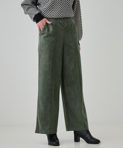 【デザイン】 スエード調の素材を使用したストレートワイドパンツです。 ウエストは後ろゴム仕様でストレスフリーで楽に着用していただけます。 センターシームのラインが入っているので、スッキリと見え美脚効果も叶います。 【スタイリング】 ハイゲージのニットやブラウスと合わせてキレイめに、 ざっくり編みのニットやスウェットとカジュアルにも合わせていただけます。 脚がキレイに見えるストレートシルエットなので、 オーバーサイズのトップスと合わせてアウトスタイルでもバランス良く着こなしていただけます。 【お客様からいただいたコメント】 ・暖かいのに軽くて、とても着心地が良いです。 去年、ベージュとピンクを買ったので、今年も購入しました。 (身長:161cm 体型:普通 グリーンのMサイズ購入) とのお声を頂戴しております。 【素材】 肌触りの良いスエード調の素材(ポンチ素材)を使用しています。 ※照明の関係により、実際よりも色味が違って見える場合があります。また、パソコン・スマートフォンなどの環境により、若干製品と画像のカラーが異なる場合もございます。 モデル情報:身長163cm B81 W59 H88 着用サイズ:02(M) 店舗へのお問い合わせ商品番号:741-69019 ●製品寸法: 01(S):W58~64cm H84cm 股下66cm 前股上32cm 渡り幅29cm 裾幅27cm 02(M):W61~67cm H86cm 股下67cm 前股上32cm 渡り幅30cm 裾幅28cm 03(L):W64~70cm H88cm 股下68cm 前股上33cm 渡り幅31cm 裾幅29cm 04(LL):W68~74cm H90cm 股下69cm 前股上33cm 渡り幅32cm 裾幅30cm 備考:
