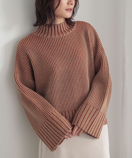 立体的な表情の編み地が特徴的な二重臼編みニット。 落ち着いた配色でコーディネートに取り入れやすく、主張し過ぎないラメ感が上品に映える一枚です。 2本の糸を同時に編むことで空気の層ができ、もちっと柔らかな着心地のニット生地。 しっかりと厚みのある生地感で、秋冬の着回しにぴったりです。 袖口はあえて広めにすることで抜け感をプラス。 襟はハイネックで首元までしっかり暖かいデザインです。 ■製品についての注意書き ニット製品につきまして。 ニット素材の持つ特性として編み上げる行程やプレス仕上げによって多少サイズや風合いの個体差が生じる場合がございます。 着用した時と実寸の長さが変わる可能性がございます。 また、着用の際ピリングが避けられず、完全に防止することはできません。毛玉取り器等で丁寧に取り除いてください。 ご了承の上、ご購入いただきますようお願いいたします。