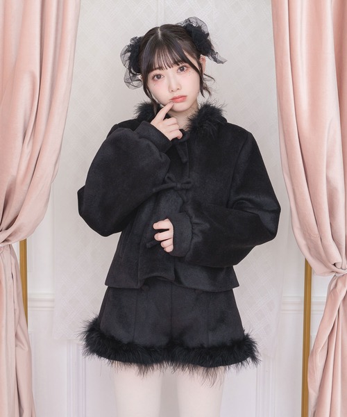 ハイウエストのハートカットがガーリーなショートパンツ♡タイトなシルエットと裾のフェザーファーで着痩せ効果も期待できる1枚◎トリプルリボンフェザーフードショートコートと同じ素材を使用しているのでセットアップコーデもおすすめです♪冬らしいホワイトとコーデを締めてくれるブラックでご用意しました♬