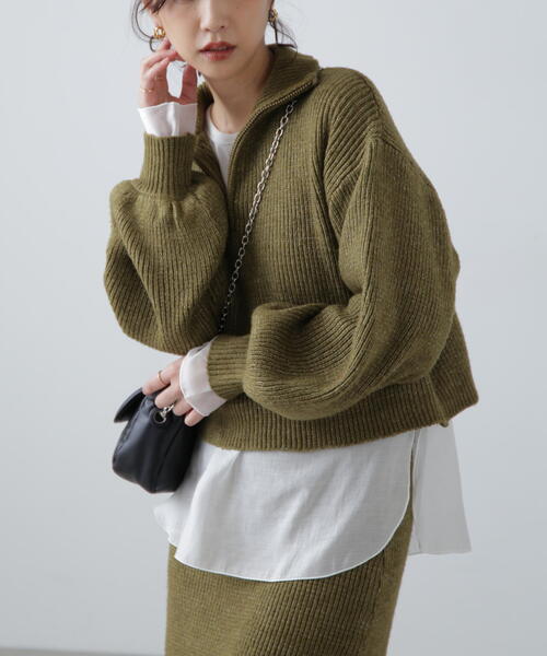 [fabric&Design] 昨年好評だったセットアップが今年も登場。 オフは悪念実績カラー。杢グレーとカーキは新色です。 軽くふんわりとした柔らかいタッチの糸を使用したハーフジップニットとナロースカートのセットアップ。 太めの糸を度詰めして編み込んでいるので厚みがあり、ナロースカートでもラインが響かず着やすいです。 トレンドのジップ使いのハーフジップニットは短丈で着回しやすいシルエット。 ナロースカートはタイト過ぎないよう裾幅を少し出し、ラインを拾わないデザインにしています。 [Styling] セットアップでスタイリングが即完成します。 ハーフジップニットは短丈なのでワイドパンツやどんなシルエットのスカートにも着回しやすいです。 ■透け感:なし ■生地の厚さ:厚手 ■裏地:なし ■伸縮性:あり ■光沢:なし ■シルエット:スタンダード --------------------------------------------------- ◆商品のお気に入り登録◆ お気に入りアイテムの値下げ・再入荷・在庫1点などの通知を受け取ることができます。 ◆ブランドのお気に入り登録◆ 新商品や再入荷、セール、クーポン配布などお得な情報を受け取ることができます。 ---------------------------------------------------