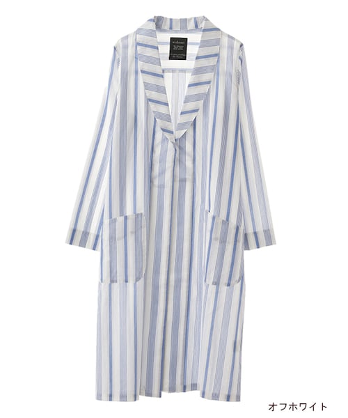 爽やかなブルーが主なカラーのガウンコート。洗いのかかったコットン100%の生地で通気性も良く春夏の羽織にぴったりです。シャツ感覚で気軽に羽織れるので挑戦しやすいです。ストライプ柄なのでIライン効果でよりすっきりと見えます。ワイドパンツにあわせるのがおすすめ。※裏地はつきません。前身頃はボタン付きません。共布のベルトが付きます。