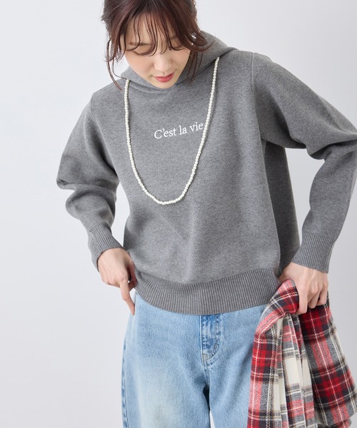 大人な表情で着こなせる。ニット素材のフーディーがお目見え。【デザイン・シルエット】 ・スウェットのようなカジュアルさを持ち合わせた、ロゴ入りのニットフーディー。 ・フードは分厚くならないよう、糸の本数を調整。 ・ドロップショルダーのゆったりフォルム。 ・体型や年代を選ばないアイテム。 【カラー】 ・チャコール(06):チャコールグレー×ホワイトロゴ ・オフホワイト(15):オフホワイト×ブラックロゴ ・ブラウン系(22):ブラウン×ブラックロゴ <ロゴの意味> C'est la vie:これが人生よね 【スタイリングポイント】 ・オフホワイトはカラーパンツで遊びを効かせて。 ・ジーンズやチノパンツでアメカジ風ルックが完成。 ・インにチェック柄やストライプのシャツを重ねるのもグッド。 ----------------------------- 裏地:なし 透け感:なし 伸縮性:ややあり 生地感・厚さ:普通 ポケット:なし 季節:春・秋・冬 ----------------------------- ※撮影時の光、お使いのモニター環境によって色の見え方が違う場合がございます。 ※モデル身長:165cm 着用サイズ:38