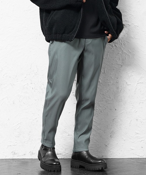 【裏起毛ウォームツイル素材 テーパードイージースラックスパンツ】 ●Design/デザイン 楽に穿けて、きちんと見える。 そんな理想を形にした、裏起毛仕様のテーパードイージースラックスです。 ウエストはゴム入りのイージーパンツ仕様で、締め付け感が少なくストレスフリーな穿き心地。それでいてベルトループを備えているため、タックインやきれいめスタイルにも自然に対応します。 シルエットは、腰まわりに程よいゆとりを持たせつつ、裾に向かって細くなるテーパードライン。脚のラインを拾いすぎず、すっきりとした印象に仕上がるため、穿くだけで全体のバランスが整います。 カジュアルになりすぎないデザインなので、スウェットやニットはもちろん、シャツやジャケットとも好相性。オンオフ問わず活躍する一本です。 ●Fabric/素材 素材には、表情のあるツイル生地を使用。 裏側には裏起毛加工を施しており、肌に触れた瞬間から暖かさを感じられます。秋冬シーズンに嬉しい保温性がありながらも、厚くなりすぎず、見た目はすっきりとした印象です。 裏起毛特有のごわつきが少なく、柔らかな肌触りなので長時間の着用でも快適。動きやすさにも配慮されており、デイリー使いに適した素材感です。 シワになりにくく、お手入れがしやすい点も魅力のひとつ。暖かさ、穿きやすさ、見た目のバランスを考えた、実用性の高い素材を採用しています。 ●カラー別おすすめスタイリング ▶ブラック 定番のブラックは、最も着回し力の高いカラー。 白シャツやニットと合わせるだけで、シンプルできれいめなコーデが完成します。足元は革靴で大人っぽく、スニーカーで程よくカジュアルダウンするのもおすすめ。オンオフ問わず使える万能カラーです。 ▶ラベンダー 落ち着いたトーンのラベンダーは、コーデにさりげないアクセントをプラス。 ブラックやグレー、ホワイトなどベーシックなトップスと合わせることで、派手すぎず今っぽい印象に仕上がります。シンプルな着こなしでも差がつくカラーです。 ▶グリーン 深みのあるグリーンは、大人のカジュアルスタイルに最適。 ニットやスウェットと合わせてもラフになりすぎず、程よく落ち着いた印象を与えてくれます。ベージュやブラックのアウターとも相性が良く、秋冬らしいコーデが楽しめます。 ▶ストライプ 縦のラインを強調するストライプ柄は、脚をすっきり長く見せてくれるのが特徴。 ジャケットやシャツと合わせれば、よりきれいめな印象に。オフィスカジュアルや食事のシーンにも使いやすい一本です。 ▶チェック 程よい存在感のあるチェック柄は、シンプルなトップスと合わせるのがおすすめ。 柄物でも主張しすぎないため、普段無地が多い方でも取り入れやすく、コーデに奥行きをプラスしてくれます。 ■生地の伸縮性 ・・・ 伸縮しません。 ■生地の透け感 ・・・ 透けません。 ■生地の厚み ・・・ 少し厚手の生地です。 ■着用のサイズ感 ・・・ ピッタリなサイズ感です。 ■裏地の有無 ・・・ 有り。 ●推奨サイズ S:~ 168cm M:169cm ~ 175cm L:176cm ~ ●モデル着用サイズ 男性モデル:175cm|Mサイズ ============================= 【お買い物をもっと便利に楽しく♪】 ■商品のお気に入り登録をすると・・・完売カラー・サイズの再入荷通知や、ラスト1点の通知、お得なセール情報も受け取ることができます! ■ブランドのお気に入り登録をすると・・・新商品や再入荷のお知らせなどいち早くブランドの最新情報を受け取ることができますのでご登録をオススメします!