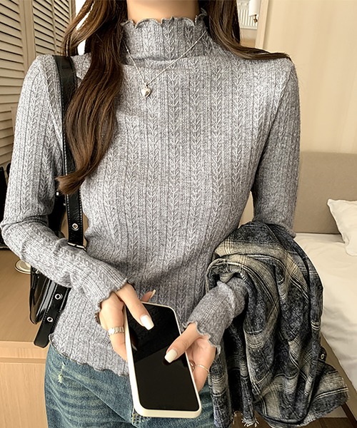 さりげないフリルのディテールが加わり、上品でありながらも華やかさを演出する一着。 ■デザイン ・ハイネック仕様で、首元をしっかりと温かく包み込んでくれます。 ・袖口や襟元に施されたメロウフリルが、フェミニンで愛らしい印象を与えます。 ・シンプルなシルエットで、程よく体にフィットし、女性らしいラインを引き立てます。 ・カジュアルにも、きれいめにも使えるバランスの良いデザインです。 ■素材 ・柔らかく肌触りの良いニット素材を使用し、心地よい着心地を実現。 ・程よい厚みでインナー使いにも最適です◎ ・伸縮性があるため、動きやすく快適な着心地を提供します。 ■スタイリング ・デニムやワイドパンツにインして、シンプルでカジュアルな日常スタイルに。 ・タイトスカートやフレアスカートと合わせて、フェミニンなコーディネートに。 ・ジャケットやコートのインナーとしても活躍し、重ね着に最適です。 ・シンプルなデザインなのでビスチェやサロペットのインナーにもおすすめです◎ ------------------------------ 透け感:なし 伸縮性:あり 裏地:なし ------------------------------ ------------------------------ 【スタッフが着用しました!】 身長:158cm 普段着用サイズ:S~Mサイズ 今回着用サイズ:FREEサイズ ・着用感 程よくゆとりはあり、すっきりとしたシルエットです◎ 柔らかいニットが肌に優しく、着心地がとても良いです。 メロウフリルがさりげなく可愛らしく、上品な印象を与えてくれます。 シンプルで使いやすく、1枚でもインナー使いにも万能です♪ ------------------------------------------------ ▼お気に入り登録 サイズ・カラーを指定して、♡マークをクリック![セール通知・ラスト1点の通知・完売アイテムの再入荷通知]を受け取ることができます。 ▼ブランドのお気に入り登録 新商品や再入荷、タイムセールやクーポン等いち早くブランドのお得な情報を受け取ることができます。