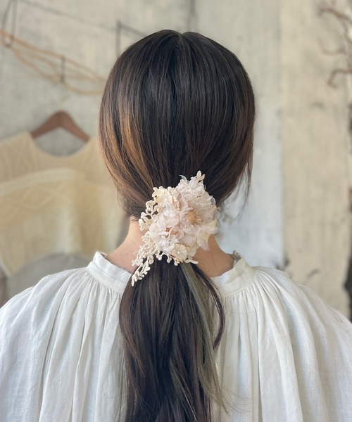 ・*:・紅茶染めシリーズ ・:*・ m.soeurでは昔から定番でお作りしている 紅茶染めアクセサリーに新色が登場! 紅茶染めしたレースにグレーのお花たちを合わせました。 今回は大きなスカビオサのお花が印象的なシリーズ* オリジナルのお花やレースはひとつひとつ手作業で紅茶染めしています。 コサージュは、スカビオサの大きなお花をメインに 葉っぱやお花のレースが隙間からちらちらと。 大きめのコサージュはいつものお洋服にプラスするだけで、 印象ががらりと変わります。 ピンとクリップがついたコサージュは ヘアアクセサリーとしてもお使いいただけます。 透け感のあるお花が お呼ばれの結婚式などフォーマルな場面にもおすすめ。 同じシリーズで組み合わせるのはもちろん 紅茶染めレースのシュシュや、コットンパールシリーズとも相性が良いアイテム。 また、同じお花を使ったスカビオサシリーズともぴったり。 ぜひいろいろなアクセサリーと合わせて、お楽しみくださいね。 紅茶染めシリーズイヤーカフ / コサージュ / ポニーフック 【m.soeur(エムスール)*】 m.soeur(エムスール)は京都発のハンドメイドアクセサリーブランドです。 植物の美しさや生命力を表現しつつもお洋服に寄り添うような、ナチュラルでクラシカルなアイテムを 制作しています。 一点一点人の手で作り上げられる手作りのアイテムは温かみがあり、使い込むごとに味わいをましていきます。 ・*:・ ・:*・ ・*:・:*:・:*・ 【注意事項】 ※こちらは一部手染めを施している商品となります。シミのように見える部分がある場合がございますが、染めの色となり、アンティークな風合いを出すためのものですので、一点一点発色が少々異なった仕上がりとなっております。 ※手作業のため、画像の商品と色、形、大きさが多少異なる場合がございますので、予め御了承下さい。 ※色落ちする場合がございますので水や雨等には十分ご注意下さい。 ※大変デリケートなお作りとなっておりますので、お取り扱いには十分ご注意下さい。