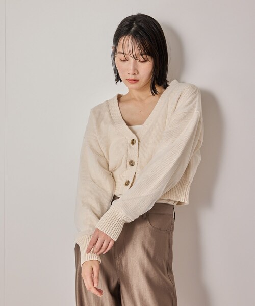 【デザイン/シルエット】 メランジ調のニットにチュールを重ねたモードなニットカーディガンです。 程良いゆとりのサイズ感と短めの丈感で、 幅広いボトムスに合わせやすいバランスで着用頂けます。 【コーディネート】 デニムでカジュアルに合わせても、ボリューム感のあるスカートで女性らしく合わせるのもおすすめです。 【素材】 数本の糸を合わせたメランジ調のリリヤーンのイタリア糸を使用しております。 ご家庭で洗濯出来るのも嬉しいポイント。 オーガニックコットン、リサイクルコットンを用いたサスティナブル素材を使用しております。 ーーーーーーーーーーーーーーーーーーーーーーー 透け感:なし 裏地:なし 伸縮性:あり 光沢感:なし 生地の厚さ:普通 ーーーーーーーーーーーーーーーーーーーーーーー 【着用サイズ】 H:168 B:80 W:61.5 H:88 着用サイズ FREE レディ/カーディガン/デイリー/クリスマス ※実際の商品はお客様のお使いの端末や閲覧環境により、写真と実物の色味や質感が多少異なって見える場合がございます。予めご了承ください。 ※伸縮性に富んだ素材のため、多少のサイズ誤差が生じる場合もございます。