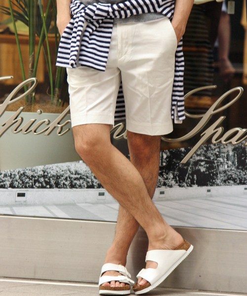清涼感のある夏の定番ショーツ 細番手の綿糸を使用し、密度に織り上げ縦糸と横糸の色を変えることでシャンブレー感を出しています。更にストレッチ糸を入れ、履きやすさも加味しています。表側のステッチを極力少なくしたクリーンな表情もポイントです。カットソーなどとのラフな合わせから、ジャケットやシャツと合わせたキレイめなスタイリングにもおすすめです。