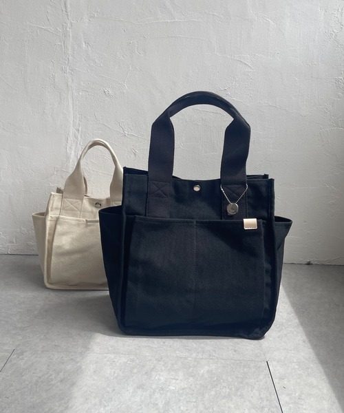 荷物の多い方でも安心な、しっかりサイズのキャンバストートバッグ。 豊富なポケット付きで、スマホやカギなどをすっきりと収納しておけます。 【素材】 自立のできる厚さのキャンバス素材。 【デザイン】 肩掛けできるビッグサイズトート。 【ikkaポイント】 ・4か所のポケットが荷物整理に便利 ・きらっと光る ikka チャーム付き ・ポイントになる皮革パーツ付き
