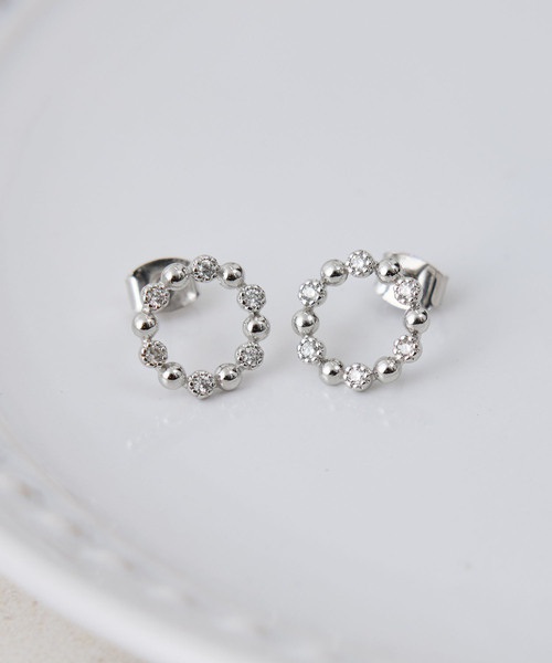 小さなサークルが表情を愛らしく魅せてくれる。【デザイン・シルエット】・ビジューを並べたサークル型のプチピアス。・耳たぶにそっと乗る、可愛らしいデザイン。【カラー】・ピンクゴールド、シルバーの2色展開。【スタイリングポイント】・シンプルなコーディネートに、ワンポイントで取り入れるのがおすすめ。・ウェアやハットにマフラーなどの小物と、カラーをリンクさせると◎。※撮影時の光、お使いのモニター環境によって色の見え方が違う場合がございます。