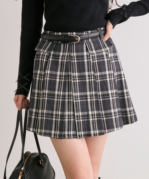 フラップデザインがアクセントになるプリーツスカート ■デザイン ・広めのプリーツで広がりすぎず、上品な大人っぽい雰囲気を演出します。 ・合皮ベルト付きでウエストマークできて、色はアイボリー/レッド系はブラウン、グレー系/ブラックはブラックです。 ・ウエストの後ろ部分はゴムで伸縮性があるので楽な着心地です。 ・裏地の形がパンツの形になっていて、ミニ丈でも安心感があります。 ・レッド系/グレー系はシーズンムード高まるチェック柄、アイボリー/チャコールは着回ししやすい無地素材です。 ■カラー ・アイボリー/レッド系/グレー系/チャコールの4色展開 ■スタイリング ・コンパクトなサイズ感のトップスと合わせるのがおすすめ。 ・フラップデザインとベルトが見えるようにトップスをインしても◎ ・チュニック丈のアイテムの裾から少し見えるように着るのもかわいいです。 -------------------- 裏地:あり 光沢感:なし 透け感:なし 伸縮性:なし 手洗い:可能 タンブラー乾燥:不可 アイロン:110℃まで -------------------- model:166cm ※着用、お取り扱いの際は、商品についている品質表示とアテンションタグを必ずご確認下さい。 ※ご覧のモニター環境や撮影環境により実際の商品と多少色味が異なって見える場合がございます。 ご理解の程よろしくお願いいたします。