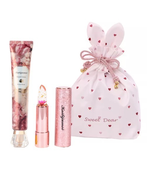 Kailijumei My Sweet Dear Collection Kailijumei(カイリジュメイ)のギフトコレクションが、新規セットを加えて再販です。 ハリと光沢のある生地にハート柄をあしらった、耳と尻尾が可愛いバニーポーチにベストセラーリップと新商品を詰め込んだ限定セット。 【コフレ内容】 ■ Kailijumei フラワーリップ 日本限定ピンクゴールドモデル(ピンク) ■ フラワーブルーム ハンドクリーム ■ バニーポーチ 《フラワーリップ》 ◆ Kailijumei フラワーリップ 日本限定ピンクゴールドモデル(ピンク) 氷の中で儚げに咲く一輪の花からインスパイアされた「カイリジュメイ フラワーリップ」。 唇の水分・体温・pHに反応して、あなただけの色に染まるマジックカラーティントです。 本物の小さな花を手作業で閉じ込めたリップは、世界に同じものが一つとしてない、唯一無二の個性を秘めています。 花の周りを煌びやかに舞うのは、純度99%の金箔。手作業であるがゆえに発生する細やかな気泡はリップがもつ個性を強め、神秘的な美しさを作り上げます。 手に取った瞬間にときめきが溢れ出し、思わず微笑んでしまうような、そんな幸せな時間をあなたに提供します。 <マジックカラーティント> 唇の水分・体温・pHに反応して、一人一人異なる色に変化する不思議なリップ。あなただけのナチュラルなピンクに発色するため、肌色を選ばず使いやすいアイテムです。リップの色選びに悩む必要もありません。 落ちにくいティント処方で、マスク着用時や飲食時もメイク落ちを気にせず、あなただけのリップカラーを楽しむことができます。色落ちしやすい口紅の下地としてもおすすめです。 また「Kailijumei フラワーリップ 日本限定ピンクゴールドモデル」は、植物由来の天然保湿成分*を配合した、高品質な日本限定のモデルです。 ・天然成分*(ローズヒップ油、ツバキ油/保湿)配合 ・トコフェロール配合(ビタミンE/保湿) 《フラワーブルーム ハンドクリーム》 ◆ Kailijumei フラワーブルーム ハンドクリーム(フローラルブーケの香り) うるおいベールで乾燥から手肌を守る、軽やかな感触のハンドクリーム。ベタつきを感じさせない、みずみずしいつけ心地で、フレッシュな「フローラルブーケの香り」がやさしく手肌を包み込みます。 まるで美容液のような、うるおいに満ちた手肌へ導く保湿成分*を贅沢に配合。スキンケアクオリティのハンドケアを日常に取り入れていただけます。 <美容保湿成分*/全て整肌・保湿成分> ・ヒアルロン酸Na(保湿成分) ・グリチルリチン酸2K(整肌成分) ・セラミドNP(整肌成分) ・ナイアシンアミド(ビタミンB3/整肌成分) ・パンテノール(ビタミンB5/整肌成分) 《内容量》 フラワーリップ:3.8g ハンドクリーム:35g Kailijumei 金粉とお花を閉じ込めた、まるでガラス細工のように美しい、斬新なデザインのコスメを展開するコスメブランド。 見た目の可愛さからSNSでも話題が広がり、今では大ヒット商品に。 見た目だけじゃなく、使い心地も夢のようなリップを展開しています。 #コスメ #ナチュラルコスメ #バースデー #クリスマス #バレンタイン #プレゼント #誕生日プレゼント #ギフト #贈り物 #ギフトセット #誕プレ #コフレ #クリスマスコフレ #クリスマス #ホワイトデー #誕生日 #母の日 #記念日