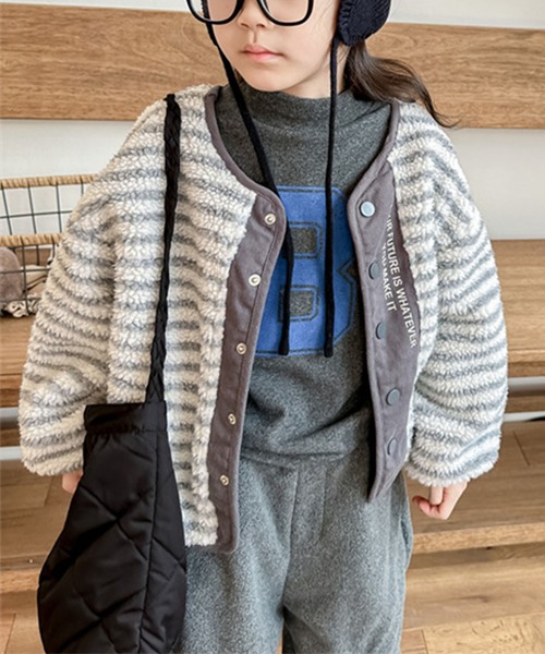 ボーダーデザインがカジュアルで可愛いボアジャケット。ふわふわとした素材感が暖かく、かわいらしい印象を与えます。フロントのボタンデザインがアシンメトリーで、英字ロゴがお洒落なアクセントになっています。スナップボタン仕様なので、子どもでも簡単に着脱可能です。シンプルながらも個性をプラスした、どんなコーディネートにも合わせやすいアイテムです。