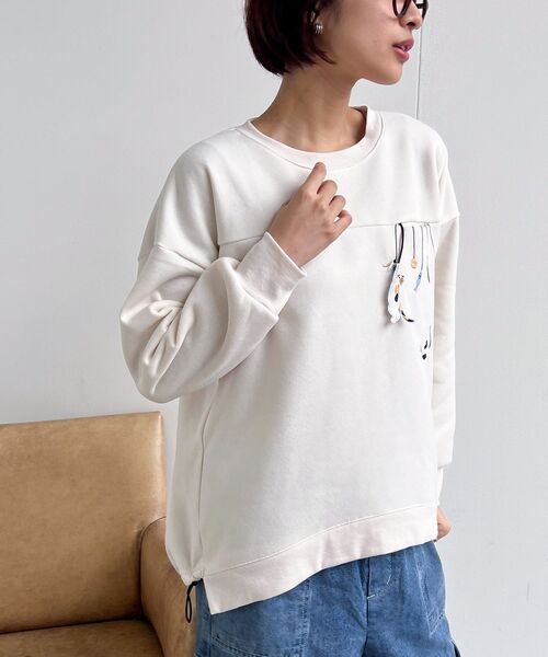 ぶらぶら揺れるアニマルが可愛いスウェットトップス 胸元で揺れる猫ちゃんとレッサーパンダがポイントのトップス。 猫ちゃんはおもちゃにじゃれて、レッサーパンダは丸太でお昼寝している様子が遊び心をくすぐります。 1枚でも暖かく着られる裏起毛で着ぶくれ防止も◎。 ゆったり着られる軽い素材なのでリラックスしてご着用いただけます。 裾後ろのドロストコードでシルエットの変化も可能。 よーく見ると後ろにも踊る猫ちゃんとけんかするレッサーパンダが・・・ 裏地なし 伸縮性弱 薄手 胸ポケットあり 裾ゴム紐入り(調節可) 織キズやだま等みられる場合もございます 洗濯:洗濯機使用可(ネット使用)