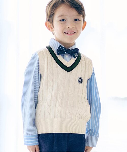 ●apres les cours(アプレレクール)のFORMAL● Vネックのラインやケーブル編みが特徴のニットベスト。 胸のアプレレクールの刺繍もワンポイントです♪ どんなシャツとも相性良く合わせやすいデザインで、フォーマルスタイルをワンランクアップしてくれます。 ▼こちらも合わせてチェック! フォーマルジャケット(V102015) フォーマルシャツ(V108025) フォーマルパンツ(V120015) フォーマルハーフパンツ(V122015) \ 嬉しいウォッシャブル加工 / お家の洗濯機で手軽に洗える 嬉しいウォッシャブルアイテムです◎ 【取り扱い表示】 40℃を上限に洗濯機で洗濯、デリケートアイテムモード、ネット使用、漂白剤禁止、色物は同系の色と一緒に、洗濯後直ちに取出し、タンブル乾燥不可、日陰で平干し、アイロン禁止、商業ドライクリーニング不可 【ご注意事項】 素材の特性上、過度の力(引っかけや摩擦等)がかかることにより、ループが飛び出したり、ほつれることがあります。 出来るだけ美しくご利用頂くために次のことにご留意下さい。 ○ 過度の力がかからない様に着用、着脱には十分ご注意下さい。 ○ 押し洗いを推奨いたします。 ○ 形を整えてから干して下さい。 ※商品により多少の誤差が生じる事がございます。あらかじめご了承下さい。 ※ご使用のパソコンやブラウザの環境により、実際の色とは多少異なる場合がございます。 ※モデル着用写真についてはイメージの為、実際の商品とカラーや仕様が異なる場合がございますので、商品画像をご覧ください。 【 apres les cours -アプレレクール- 】 「キオク いろどる、こどもふく。」 大切なキオクを彩る、お気に入りの一枚。 「アプレ レ クール」は独自の色づかいやテキスタイルで日々をトクベツに過ごせる そんな「一枚」をお届けします。