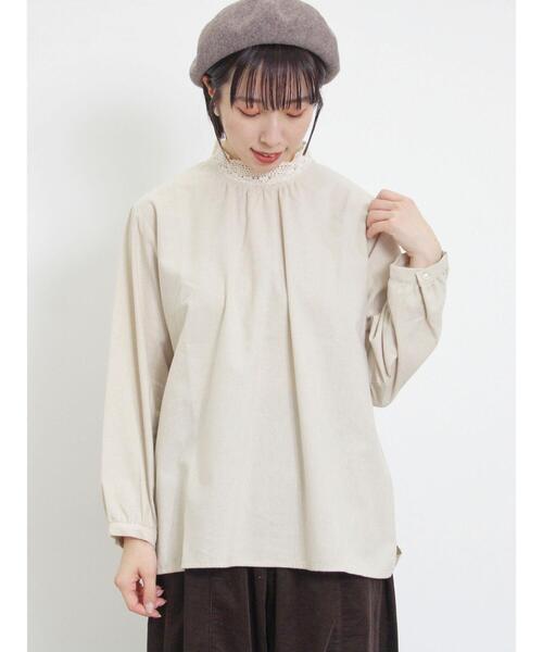 襟レースが愛らしさをプラスするナチュラルガーリーなブラウス。ギャザーを加えることで、柔らかなふくらみのあるシルエットを生み出します。保湿加工が施されており、優しい着心地なのでデイリーユースにも◎重ね着しても襟のレースがちらりとのぞくのが可愛いアイテムです。※商品画像は、撮影環境やお客様のご利用のPC・スマートフォンのモニター環境などにより実物と色味に差異がある場合がございます。