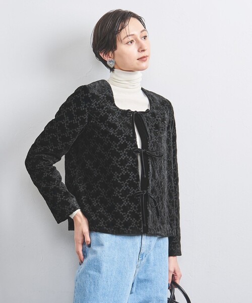 オリジナルフラワー刺繍が印象的な主役顔のベルベットジャケット■デザイン丸みのあるスクエアネックとフロントのリボンがポイントのノーカラージャケット。■素材ベルベット素材をベースに、レーヨン糸で小花刺繍を施しています。高級感あるベルベットの光沢と起毛感に目立ち過ぎないユナイテッドアローズオリジナル刺繍が特徴です。■コーディネートワンピースの羽織りとしてオケージョンとしても、タートルネックインナーと単品パンツ合わせで普段使いにもシーンレスで着こなしを楽しめます。・同シリーズのワンピースのご用意もございます。 対象品番: 15262663866============================裏地:あり透け感:なし伸縮:なし光沢感:ややありケア方法:ドライクリーニング============================【注意事項】※商品を使用前に、タグ等に記載されている「取り扱い上の注意書き」、「洗濯表示」を必ずご確認ください。※商品画像は、光の当たり具合やパソコンなどの閲覧環境により、実際の色味と異なって見える場合がございます。あらかじめご了承ください。※商品の色味の目安は、商品単体の画像をご参照ください。店舗へお問い合わせの際は、全国のUNITED ARROWS各店舗まで下記の品名/品番をお申し付けください。品名:UBCMD VELVET EMBFLW RBN 品番:15222662996