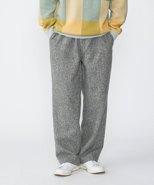 カラーツイードを使用した上品なイージーパンツ 【素材特性】 ポリエステルにレーヨンを混紡したカラーツイード生地を採用。 表情豊かな色使いとウォーム感のある風合いが特徴で、秋冬から春先にかけて使いやすい生地感です。 【デザイン】 繊細なツイードの表情が映えるシンプルなデザイン。 ウエストゴムのイージー仕様で、内側に配したドローストリングでフィット感の調節が可能です。 カジュアルからきれいめまで合わせやすい、ややゆったりめのワイドテーパードシルエットで仕上げています。 【スタイリング】 暖かみのあるカラーリングで、無地から柄物まで様々なトップスと相性抜群。 全体を同系色でまとめれば、洗練されたトーンオントーンコーデを楽しめます。 【注意事項】 ※末永く愛用頂く為に、アテンションタグ・洗濯ネームを必ずご確認の上、着用又はお取り扱いください。 ※撮影環境による光の当たり具合やパソコン・スマートフォンなどの閲覧環境によって、実際の色味と異なって見える場合があります。 商品の色味は商品単体で撮影した画像をご参照ください。 ※画像の商品はサンプルです。 実際の商品と仕様、加工、サイズが若干異なる場合がございます。