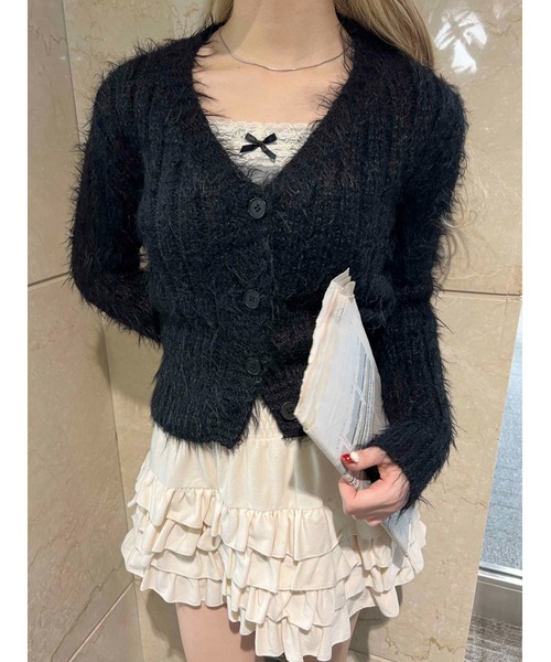 今年トレンドど真ん中★ ほわほわ手触りのいいシャギータッチのニットカーディガン コンパクトなシルエットで着ぶくれせずスッキリ着られます。 -fabric&style- 毛足の長いシャギーは空気をたっぷり含んであったかい! ボリューミーになりがちなシルエットはウエスト部分をタイトにすることでメリハリをプラス。 羽織としてもプルオーバーニットとしても使える2way仕様です。 デコルテをきれいに見せるVネックで首元のレイヤードも楽しい! ▼便利なお気に入り登録▼ 商品のお気に入り登録で、再入荷の通知・ラスト1点・お得なセールの通知を受け取ることができます。 ブランドのお気に入り登録で、新商品や再入荷など、さらにお得な通知を受け取れます。 《Attention》 ・撮影はサンプル品を使用しており、実際の商品とは仕様や加工・サイズ等が若干異なる場合がございます。 ・撮影場所や照明の照射・角度、お使いのモニター環境により色味や仕様、加工、カラーが若干異なる場合がございます。 ・商品によっては1〜3cm程度の採寸誤差がある場合がございます。 ・移染等防止のため水や汗で濡れたまま放置することは避けて頂き、濃色アイテムは単体でのお洗濯をお願い致します。 ・素材臭がある場合は陰干しをお願いいたします。 ・アテンションタグを必ずご確認の上ご使用下さい。