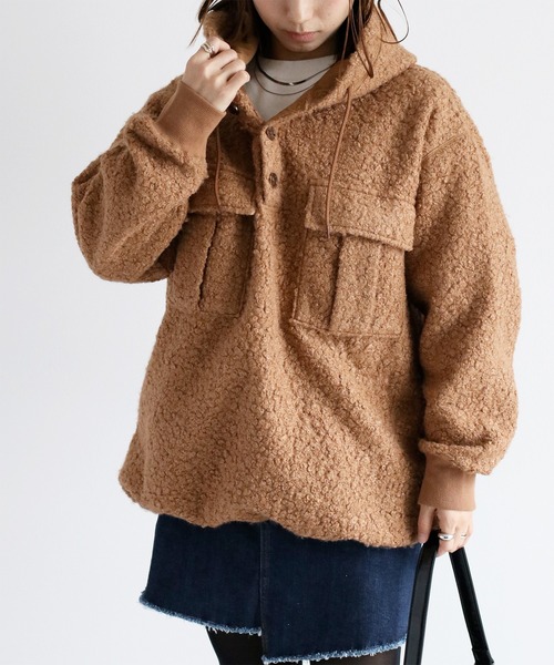 プードルのようなくりくりとしたボアがかわいいフーディチュニック。厚手のニットなども着込めるゆったりとしたオーバーサイズで、様々なボトムに合わせやすいのもポイント◎モコモコとした表情がシーズンムードを盛り上げてくれる飽きのこないアイテムです。春先の少し寒い時期にも大活躍!◇Point◇カジュアルなディテールながらも、どのようなスタイルにも落とし込めるのもポイント◎ヒップをさり気なくカバーしてくれる丈感で体型カバーも叶えます。袖部分はリブの切り替えデザイン。程よくスポーティーな印象も持っています。裾にはドローコードを施し、絞ることでシルエットに変化が楽しめます☆◇Material◇ポリエステル糸を使用しているのでとてもフワフワ軽い着心地です。あたたかく、体型カバーもできて可愛い。これ1枚で全て叶えてくれますね☆スマートフォンが収容できる大きめ胸ポケットがあるのも嬉しいポイント◎◇Coordinate◇落ち着いたカラーリングなので、モノトーンのボトムと合わせてきれいめにまとめて、通勤などでも活躍します。中にタートルネックインナーを着てチラ見せするのが今季のオススメ!春先にはボタンを開けて、カジュアルロゴTを着用するのもかわいいです。普段のコーデにMIXするだけで、よりお洒落な印象に仕上がります☆ちょっとそこまでのお出かけにも気軽に羽織れます。※照明や天候により実際の色味と異なって見える場合がございます。ご了承くださいませ。【キーワード】#Y2K#メンズライク#アノラック#パーカー