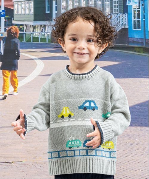 道路や線路を走る乗り物をデザインしたニットプルオーバーです。 バックの裾部分にもモチーフがほどこされており、どの角度から見ても楽しい一枚。 衿ぐりと袖のバイカラー配色がアクセントになっています。 ゆったりとしたシルエットのため、トレーナー感覚で気軽に着れるのが魅力。 ウォッシャブル仕様なので、ご家庭の洗濯機で簡単に洗えます。 内側にお名前を記入できるタグつきです。 【透け感】透けない 【生地の厚さ】厚い 【伸縮性】あり 【裏地】なし 【ポケット】なし
