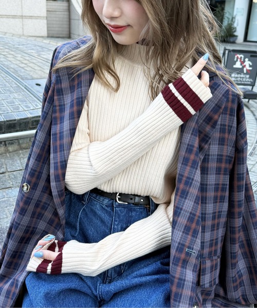 ■デザインもちもち、着心地のよいニット素材のハイネックインナー衿・裾とカレッジな雰囲気の袖の配色ラインがPOINT◎少し長めの袖丈でレイヤードして袖をくしゅくしゅみせるのがおすすめ♪ベーシック系2色キャッチーなカラー2色の4色展開。一枚で着てもかわいいフィンガーホールも付けています◎親指を通す指穴があるので、暖かさも抜群なのもおすすめポイントです★■素材・伸縮性:あり・透け感:なし・厚み:やや厚い・肌触り:チクチクしない※生地寄りの画像が実際の色味と近いものとなります。※ご覧のモニター環境や撮影環境により実際のカラーと異なる場合がございますので画像をご参照の上、ご了承頂けますようお願い致します。