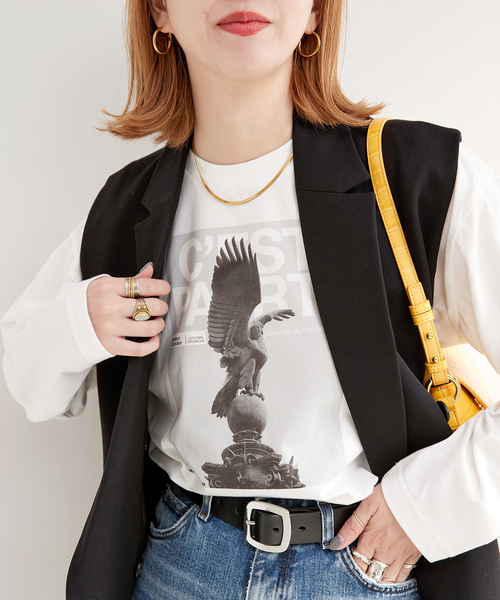 弊社カラー:メーカーカラー ホワイト(010):CEST ホワイト A(011):HARMONIE ホワイト B(012):BONNEJOURNEE ほどよい存在感がコーディネートのアクセントになるフォトプリントロンT。 さらっとしたやわらかい生地感で、一枚ではもちろん、レイヤードスタイルにも合わせやすいアイテムです。 グラフィックはパリの街中や建物の写真とタイポグラフィを組み合わせて、別注用のフォトプリントTシャツに仕上げています。 手洗い可能でご自宅でのイージーケアができるのも嬉しいポイント! 【MCL/エムシーエル】 ブランド名は「Mille Confection Leisurewear」の略になります。 Mille = 千の Confection = 既製服 Leisurewear = レジャーウェア、簡単な服 1980年からフランスを中心にヨーロッパで展開していたレジャーウェアブランド。 さまざまなシーンのユニフォームやデイリーウェアとして、企業用やイベントウェアと幅広く活用されていました。 印象的なブランドアイコンが特徴で、古着市場でも目にすることが難しいブランドのひとつとなっています。 ※取り扱いについては、商品についている品質表示でご確認ください。 ・洗濯や着用を繰り返すことにより素材の特性上、毛玉(ピリング)が生じます。必要以上の摩擦は毛玉の原因になりますので、お避け下さい。連日の着用は避け、毛玉が生じた場合は引っ張らず、小バサミで丁寧にカットしてください。 ・この商品は、強い日光(又は照明)を長時間受けますと変色の恐れがありますので、御着用及び保管の際には御注意下さい。 ・この製品は特殊加工品です。永久的なものではなく、着用や洗濯の繰り返しでプリント部分がひび割れたり脱落や白化が生じることがあります。摩擦や、汗、水などで濡れたことによる、他のものへの色移りにご注意ください。プリント部分はもみ洗いせず、タンブラー乾燥はお避け下さい。脱水は短時間で行い、プリント同士がつかないようにしてください。保管の際、プリント部分に他の物が当たらないようご注意ください。 ※洗濯について ・裏返しにしてネットを使用して下さい。 ・特殊プリントの為、短時間でお洗い下さい。 ・プリント部分のアイロンはお避け下さい。 ・アイロンはあて布をし、軽く裏から掛けて下さい。 ・この製品は光により退色しやすいので ・太陽光や蛍光灯等が長時間当たる所で保管しないでください。 ・洗濯・乾燥で多少縮むことがあります。 ・長い時間濡れたままにせず、洗濯後は、形を整えてすばやく干してください。 ※こちらの商品は、B.C STOCKでの取り扱いになります。 直接店舗へお問い合わせの際はB.C STOCK店舗へお願い致します。 ※照明の関係により、実際よりも色味が違って見える場合があります。またパソコン・スマートフォンなどの環境により、若干製品と画像のカラーが異なる場合もございます。 ※商品の色味は、商品アップ画像をご参照ください。 ホワイト、ホワイト B着用スタッフ:163cm 着用サイズ:フリー ホワイト A着用スタッフ:157cm 着用サイズ:フリー 詳細着用モデル:163cm 着用サイズ:フリー 本体:洗濯機洗い(弱)