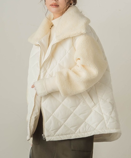 異素材切り替えデザインで、スタイリッシュな遊び心をプラス。●POINTシーズンムード高まる、理想のボア×キルトジャケット。ふわふわのボアを胸元に配置した、旬感あふれるスタンドカラーブルゾン。表情豊かなキルティングの立体感は、羽織るだけでワンランクアップの着こなしに。裾回りはドロスト仕様なので、好みのシルエットに調整して着回し力アップ!上品な素材感と暖かな着心地で、毎日着回したくなること間違いなしです◎●FABRIC季節感たっぷりのボア素材に、上質な光沢感のキルト生地をドッキングしたこだわりのデザイン。羽織るだけで目を惹くコーデが完成します。●COORDINATE中にニットも合わせられるゆったりさと暖かな着心地で、防寒もバッチリ◎。肌寒い季節から本格的な冬まで、ロングシーズン大活躍間違いなしの1枚です。程よいボリューム感のビッグシルエットは、スニーカーやデニム、キャップなどと合わせた、トレンド感のあるスポーティーコーデやストリートコーデとの相性バツグン。絶妙な丈感なので、チュニックやフレアパンツ、ミニスカートやロングブーツなどのレディライクなアイテムと合わせて、程よくフェミニンなコーデも楽しめます。----------------------------------透け感:なし厚さ: 厚い伸縮性:なし裏地: ありポケット: あり--------------------------------------------------------------------洗濯方法家庭洗濯:家庭での洗濯禁止アイロン:アイロン仕上げ禁止。ドライクリーニング:石油系溶剤による弱いドライクリーニングができる。----------------------------------■モデル身長 162cm 着用サイズ M※画像の商品はサンプルとなりますので実際の商品と仕様、加工、サイズが若干異なる場合がございます。※お客様のモニター環境により実際のお色と多少異なる場合がございます。※撮影状況や光の当たり具合により、色合いが異なって見える場合がございます。▼商品のお気に入り登録ハートマークをクリックし、お好きなカラーを選んでお気に入りに登録完売カラーの再入荷通知や、ラスト1点の通知、セールの通知も受け取ることができます。▼ブランドのお気に入り登録新商品や再入荷等、いち早くブランドのお得な情報を受け取ることができます。