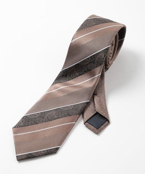 【大剣にストライプシャドーペイズリー柄、ノット部分と小剣にピンドット柄のクレリックタイ】シルク100%の上品な光沢感、しっとりとした肌触りが特徴のクレリックタイです。結んだ際に大剣のシャドーペイズリーとストライプを切り替えた柄、結び目のピンドットと2つの異なる柄をみせられ、遊び心とオシャレ感を楽しめます高級感ある見た目だけではなく、キュッと締めやすく結び目が解けにくいのも魅力です。ビジネスからパーティーシーンまで幅広く使用できます。ご自分用はもちろん、女性からのギフトにもおすすめです。【カラー】「シルバー」「ベージュ」「ターコイズ」「ボルドー」「ネイビー」の5色展開※照明・光の加減、PCやスマートフォンなどの環境により、製品と画像のカラーの見え方が異なる場合がございます。※画像はサンプルのため、色味やサイズ等の仕様が変更になる場合がございます。※サイズは弊社規定の採寸によって記載しておりますが、若干の個体差が生じる場合がございます。