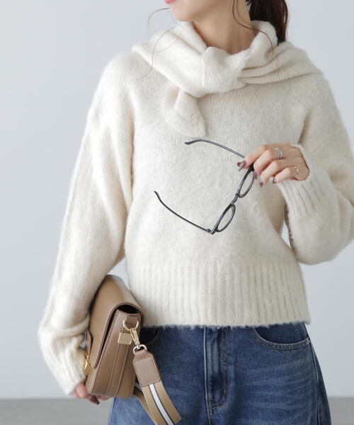 〔fabric&design〕 シャギーの起毛加工を加えた毛足あるふんわりとした編地が特徴のニット。 首元が程よく開いたクルーネックでルーズなシルエットのプルオーバーに、同じ糸で編み立てたスカーフとのセットです。 スカーフはストールのように単品としても使い回しが効き、スタイリングのアクセントになってくれます。 〔styling〕 カジュアルにデニムパンツとのコーディネートや、ミニスカートやプリーツスカートコーデと相性よく合わせていただけます。 スカーフはフロントにリボンが来るような結び方がおススメです。 ■透け感:なし ■生地の厚さ:厚手 ■裏地:なし ■伸縮性:あり ■光沢:なし ■シルエット:スタンダード --------------------------------------------------- ◆商品のお気に入り登録◆ お気に入りアイテムの値下げ・再入荷・在庫1点などの通知を受け取ることができます。 ◆ブランドのお気に入り登録◆ 新商品や再入荷、セール、クーポン配布などお得な情報を受け取ることができます。 ---------------------------------------------------