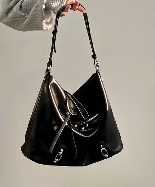 ------------------------------ショルダーバッグ。------------------------------バックルやファスナーがポイントデザインになったY2Kや韓国ファッションとの相性が良いバッグ。大きめのサイズ感なので荷物が多くなってしまいがちな方も安心です。ベーシックなブラックカラーですがシルバーのポイントでトレンド感のあるアイテムです。カジュアルスタイルやガーリーな服装と合わせてミックススタイルも可愛く仕上がります。カラー展開ブラックサイズFREE(縦: 約29cm× 横: 約36cm× マチ: 約14cm)仕様ファスナーポケット×各1(内側/外側)Attentionお使いのモニターの環境により実物の商品と見た目の色に多少違いがある場合がございます。お気に入り登録機能の使い方 ▼商品のお気に入り登録完売カラーの再入荷通知や、ラスト1点、セールの通知をお知らせいたします。▼ブランドお気に入り登録新商品や再入荷・クーポン配布など、ブランドの情報を受け取ることができます。