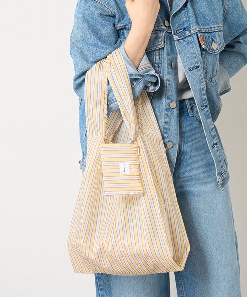 ポーチやポケットがついた機能性◎なエコバッグオリジナルでデザインしたストライプ柄のエコバッグ。同柄のポーチつき、バッグ本体には内ポケットがついており、食材や荷物がたっぷり入る大容量。ポーチはカラビナ付きなので、いつも使うバッグやパンツのベルトループにも取り付けが可能。ユニセックスで使えるストライプ柄はエコバッグとして、サブバッグとしてもマルチに使うことができます。素材は軽量で簡単に小さく折りたためるので、場所をとらないのも◎