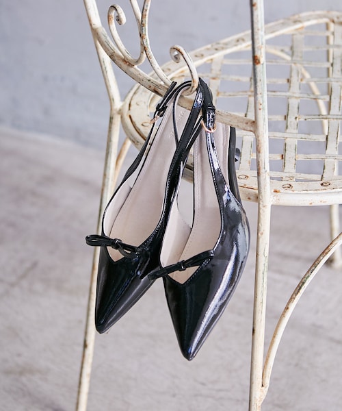 ◆2025春夏◆ 【デザイン・シルエット】 Vカットラインに掛かる華奢なフロントリボンが足先を女性らしく演出してくれるパンプス。 つま先のトライアングルから肌がチラと見えるのも女性らしいポイント。 スリングバックデザインなのでソックスを合わせたりと幅広く使え、 シーズンレスでお使いいただけます。 セレモニーシーン(卒業式/卒園式/入学式/入園式)からお仕事・普段のお出かけまで幅広いシーンに活躍! <POINT> ・柔らかいアッパー。 ・目の詰まったクッションを採用し、しっかりとしたクッション感とヘタレにくい仕上がり。 ・ヒールは低めで疲れにくく、くびれがあるので女性らしい印象。 ・踵にかかるストラップは調整できるのでソックス合わせもしやすいです。 【素材】 ブラックは少しシボのあるエナメルを使う事でフォーマル過ぎず幅広いスタイリングに合わせやすくしています。 シルバーは程良いツヤを感じられるシワのある生地を採用しています。小傷も目立ちにくいです。 【カラー】 ブラックとシルバーの2色展開です。 【おすすめのスタイリング】 デニムやワイドパンツと合わせて頂くのがおすすめです。 ※一部の箱に配送の際についてしまった、へこみなどがある場合がございますが、商品に問題はございません。
