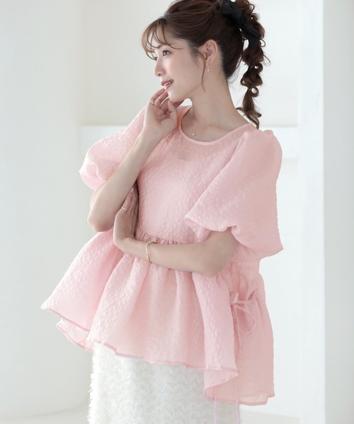 バルーンスリーブサイドリボンシアーブラウスふんわりとしたシアー素材が軽やかな印象のブラウス。立体感のあるジャカード生地に、ボリュームのあるバルーンスリーブが女性らしさを引き立てます。サイドには華奢なリボンをあしらい、可愛さと上品さを両立。ゆったりとしたシルエットで体型をカバーしつつ、動くたびに柔らかく揺れるシルエットが魅力。一枚で主役級の存在感を放つ、フェミニンなブラウスです。■point・透け感のある軽やかなシアー素材で、春夏にぴったり・サイドリボンがアクセントになり女性らしさを演出・ふんわりバルーンスリーブで華やかさアップ・ヒップラインをカバーする安心の丈感・インナーキャミ付きで透け感も気にならない仕様■styling・デニムを合わせて甘辛ミックスコーデに・スラックスを合わせて上品なオフィスカジュアルに・ロングスカートと合わせてとことんフェミニンに・パンプスやヒールを合わせてお出かけコーデにもおすすめ【伸縮性】なし【裏地】なし(インナーキャミ付き)【透け感】あり■size【FREEサイズ】〈トップス〉着丈(前)約64cm/(後)約71cm肩幅約28cm袖丈約33cm袖口約11cm身幅約49cm裾幅約104cm〈インナー〉着丈約44〜52cm身幅約41cm裾幅約41cm◆注意事項※大変デリケートな素材を使用しているため、お取扱いには十分お気を付け下さい。※なるべく実物に近い色合いを再現しておりますが、お使いのモニターにより実際の商品カラーとは異なる場合がございます。※同商品・同色におきましても、染色やロットによって色合いや風合いなどが多少異なる場合がございます。※画像は参考画像です。写真と実際の商品の色・型が多少異なる場合がございますので、予めご了承ください。※生産の過程上、寸法に多少の誤差(±2cm)が生じる場合がありますが、品質・着用上に問題はございません。