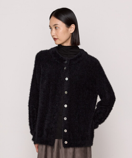 《デザイン》 上品な光沢の毛足ともっちりとした手触りが魅力のフェザーヤーンカーディガンです。 今年はウールブレンド糸をプレーティングして、さらにもっちりリッチな素材感に仕上げています。 また、この時期に嫌な静電気対策として、脇や袖下にグレー色の静電気防止テープを縫い込んでいます。 ゆったりとしたシルエットとシンプルなデザインですが、圧倒的な素材感がプラスされることで、ぱっと華やかにワンランク上のスタイリングを演出できる一枚です。 肘から下のフリンジジャカードの様なダイヤ柄がポイントです。 この柄編みで軽さをだして、ふんわりとしたパフスリーブシルエットを形つくっています。 カーディガンとしてはもちろん、後ろ前に着ることでプルオーバーとしても着られます。 《素材》 <マイクロナイロンフェザー>イタリアPINOLI社が開発した、マイクロナイロンを使用した長い毛足が特長のフェザーモールです。 鮮やかな発色と上品な光沢感があり、非常に柔らかく肌触りが良いのが特長です。 <バソランウールブレンド>防縮加工したウール糸とアクリルを混紡した、柔らかく、しわになりにくいイージーケア素材です。 《注意事項》 多少縮むことがありますが、手洗い後に形を整えてから日陰で平干ししてください。 ハンガーに掛けたまま保管しますと自重による伸びが発生しますので避けて下さい。 お手入れ方法:手洗いOK