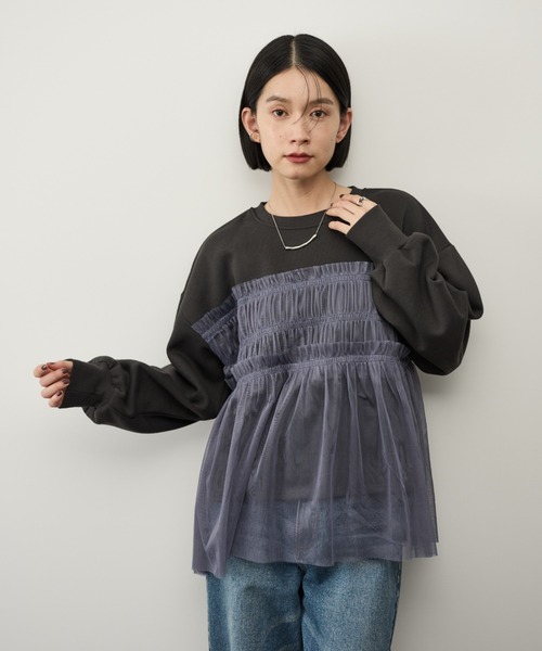 【Shelly island /シェリーアイランド】 人気のチュ-ル素材と重ねたトレーナーTOPS ・エレガントさとカジュアルさが絶妙に融合したチュールドッキングプルオーバー。 ・柔らかな裏毛素材に、繊細なチュールを組み合わせたデザインが特徴です。 ・上品でフェミニンな印象を与えながら、リラックスした着心地を提供します。 ・バスト部分にあしらわれたチュールが、シンプルなシルエットに華やかさをプラス。 ・カジュアルなデニムやパンツと合わせて日常使いに、スカートと合わせて特別な日にも活躍する一着です。 ・季節の変わり目にぴったり。レイヤードスタイルも楽しめる万能なアイテムです。 《fabric》 ・透け感:無し ・裏地:なし ・伸縮性:若干あり ・生地の厚さ:普通 ◆商品のお気に入り登録 【♡】登録のお願い 完売カラーの再入荷通知、残り1点の通知、セール等値下げした時の通知も受け取ることができます。 ◆ブランドのお気に入り登録 新商品や再入荷など、いち早くブランドのお得な情報を受け取ることができます。 是非ご活用ください。 ※サンプルにて撮影をしておりますので、実際の商品と柄の出方が異なる場合がございます。 ※この商品は、摩擦や、汗・雨などによる水ぬれにより色落ちが生じる場合がございます。 衣服や周囲のものに色移りする恐れがありますので、白色や淡色のものと組み合わせる際は、十分にご注意ください。 ※撮影環境により多少実際のカラーと異なる場合がございます。 ※生産時期により若干の色ブレやサイズの変動が生じる場合がございます。 ※表示のサイズ感と実物は異なる場合もございます。