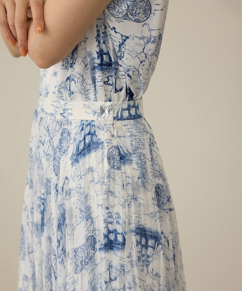 【デザイン・シルエット】 透け感と張り感のある素材にタックプリーツを施すことで、立体感と表情のあるシルエットになっています。また、左脇のベルトにアクセントとなるクリスタルパーツを施し、より華やかなアイテムになっています。 【カラー】 18世紀フランスの人物や風景などをモチーフに、主に2色使いのデザイン布や柄のことであるトワルトジュイプリントを施した素材を使用。 【おすすめのスタイリング】 華やかな印象として、同素材で展開しているトワルドジュイのブラウスと同色合わせがお勧めです。また、普段使いとしては、シンプルなニットやTシャツ合わせもお勧めです。 【素材】 程良い張り感のスパンオーガンジーにトワルドジュイのプリントを施しています。 ---------------------------- 透け感:あり 裏地:あり ※ぺチスカート付き 伸縮性:なし 光沢感:ややあり 生地の厚さ:薄手 ポケット:なし 開き方:ファスナー ---------------------------- 【モデル情報】 モデル身長:171cm 着用サイズ:38 【トワルドジュイ シリーズ】 同素材でデザイン違いの ベルテッドミニワンピース(品番: GGE25000) キャミソールセットブラウス(品番:GGH25040) タックプリーツスカート(品番:GGC25040) がございます。 ※洗濯絵表示 1段目…ペチコート 2段目…本体 ※画像の商品はサンプルです。実際の商品と仕様、加工、サイズが異なる場合がございます。 ※撮影場所やライティング、お使いのモニター環境によって色の見え方が異なる場合がございます。 ※商品のカラーは画像の色味をご参照ください。動画は仕様説明のため、色味が実物と異なる場合がございます。