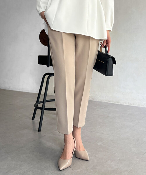 セレモニーにもおすすめ! 美脚効果抜群の上品テーパードパンツ ■point 程よい厚みのあるジョーゼット生地が高見え効果抜群! ブラックは無地とドット、ネイビーはドット、ベージュは無地でご用意 しており華やかさと上品を兼ね備えたパンツです。またMサイズとPMサイズを ご用意。伸縮性のある生地感なので細身ながら履き心地も◎ また後ろはゴム仕様なのでストレスフリーな履き着心地です。 (サイドはコンシールファスナーの仕様。布地が厚くなっているため 上げづらくなりますがB品ではないためご了承ください) ■coordinate 同生地のペプラムブラウスと合わせてセレモニースタイルに。 またお仕事スタイルにもおすすめ。 OFFスタイルにはニットやカットソーなどと合わせて幅広いシーンでえ 活躍するアイテムです。 ▼オススメスタイリングアイテム▼ 【セレモニー対応可】ペプラムブラウス 【セレモニー対応可】ペプラムジレジャケット 【セレモニー対応可】シンプルブラウス ペプラムチュニックブラウス ■fabric ポリエステル96%ポリウレタン4% -------------------------------------------------- 裏地:なし 光沢感:ややあり 伸縮性:ややあり 生地の厚さ:普通 洗濯方法:手洗い可 -------------------------------------------------- 【キーワード】 #体型カバー#着痩せ#大人カジュアル#お出かけ#ママコーデ#シンプル#プチプラ #女子会#高見えこーで#オフィスカジュアル#デート#参観日#セレモニー -------------------------------------------------- ※生産の都合上、お届け時期が前後する場合がございます。 ご注文いただいた予約商品のお届け時期の確認は、注文履歴ページより行えます。 ※商品画像は製品前サンプルのため着用イメージです。 光や角度により、実物と色味が異なる場合がございます。また表示のサイズ感も実物とは若干異なる場合もございますので、ご了承ください。 ※着用、お取り扱いの際は、商品についている品質表示とアテンションタグを必ずご確認ください。 -------------------------------------------------- ♡をクリックでお得な情報をお知らせいたします。 <商品お気に入り登録> お気に入りアイテムのお値下げ・再入荷・在庫ラスト1点など通知を受けることができます。 <ブランドお気に入り登録> Chez toiの新商品・再入荷・SALE・クーポン配布などお得な情報を受けることができます。 -------------------------------------------------- Cheztoi/シェトワ フランス語で「あなたの家」という意味。 自分にまっすぐでそしてしなやかに生きる女性に向けたブランドです。