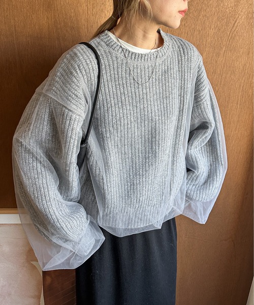 ◆Detail シンプルな畦編みニットの上にチュール生地がドッキングされたデザインニット。 チュールの存在感を際立たせるためニットのサイジングより多めに生地を取りふんわり感が楽しめるデザインに◎ 着丈はあえてそこまで長めに設定せずジャストで着られるため、身長問わず着合わせられる一着です。 ニットはしっかりとした肉感があり温かくお召しいただけますが、チュールの軽やかさもあるため春先まで着回せるのも嬉しいポイント。 ◆Fabric -------------------------- 透け感:なし 伸縮性:あり 光沢:なし 生地の厚さ:★★★★☆ お手入れ方法:手洗い可 -------------------------- ※この商品は、素材の特性上、着用の際ピリング(毛玉)が発生する場合があります。 ピリングは引っ張って取ろうとせず、小さなハサミや毛玉取り器などを使用し丁寧に取り除いてください。 ※汗や水、摩擦により他のものに色移りすることがありますのでご注意ください。 ※濃色製品は色移りすることがありますので、他の物と分けて洗濯してください。 ※生産時期によりサイズや質感・色味に若干の個体差がみられる場合がございます。 ※商品画像は、光の当たり具合やパソコンなどの閲覧環境により、実際の色味と異なって見える場合がございます。 予めご了承ください。 ※着用、お取り扱いの際は、商品についている品質表示とアテンションタグを必ずご確認ください。 ◆Information 欲しいitemをお気に入り登録(♡マークをclick) ・お買いのがし対策…完売itemの再入荷やラスト1点の情報をお知らせ ・欲しいitemをお得にget…pricedownになったらいち早くお知らせ ・スムーズ検索…ZOZOのお気に入りアイテムページで簡単checkできるから、再検索不要♪