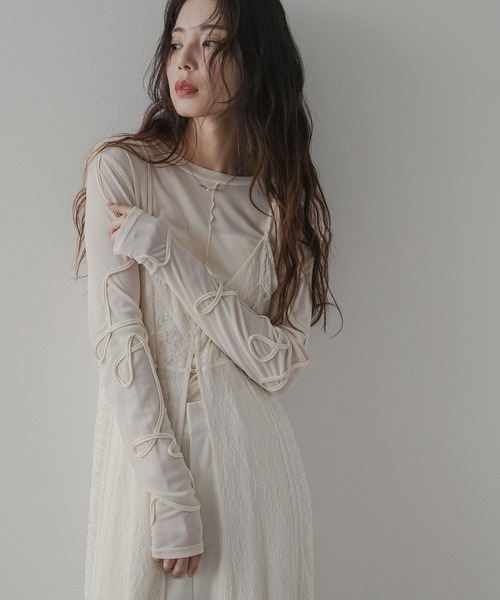 ループリボンデザインが目を引く トレンドコーデを楽しめるシアーデザイントップス 【ディティール】 軽やかで女性らしい、ほんのり透け感のあるシアートップス。 立体的なループリボンデザインがアクセントになりいつものコーデをアップデート。 単品使いもレイヤードコーデにも使いやすい着回力も抜群◎ カラバリも楽しめる4色展開でご用意。 幅広いアイテムとの合わせやすさ、抜け感、コーデのアクセント。 取り入れるだけでトレンドコーデが完成する1着です。 【素材】 透け感のあるシアー素材。 肌触りもよくソフトな着心地を体感していただけます。 ※繊細な素材感のため取り扱いにはご注意くださいませ。 【コーディネート】 デニムやパンツ、スカートと合わせて1枚でシアー感を楽しむトレンドコーデ。 ワンピースやジャケットの下に忍ばせ抜け感を楽しめるレイヤードコーデ。 ベーシックから春らしさも取り入れれるアイテムです。 ********************** 透け感:あり 裏地:なし 伸縮性:ややあり 光沢感:なし 生地の厚さ:薄い **********************