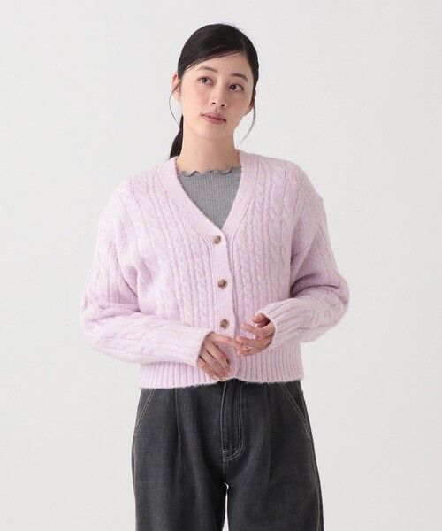 ふわふわ感のある糸を使用した、ケーブル柄のVネックカーディガンです。深めのVネックに仕上げているため、襟がフリルやメローになったインナーを合わせたりと、さまざまなコーディネイトをお楽しみいただけます。袖まわりや身幅に程よいゆとりを与えており、立体的なケーブル編みも相まって華奢見えを叶えてくれるアイテム。カラーはお好みで選べる3色展開なので、全カラー揃えて着まわしするのもおすすめですよ。ニットアイテムながら、ご家庭の洗濯機で簡単にお手入れできます。旬のスタイリングにマッチするコンパクトな着丈もポイント。Iラインにもボリュームシルエットのボトムスにもバランス良くマッチします。*洗濯の際はネットを使用してください。*アイロンを掛ける際はあて布を使用してください。 *1点ごとに柄の出方が違うことがあります。