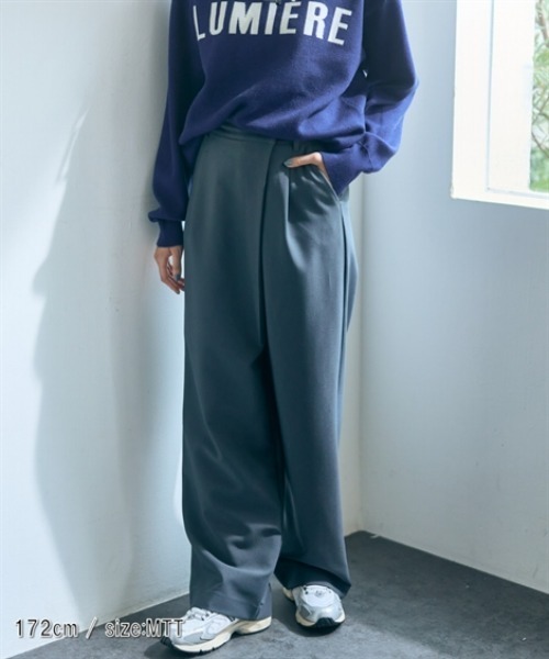 【高身長な方向け】こなれ感を演出してくれるラップ風ワイドパンツ■デザイン・アシメントリーなラップデザイン。・フロントタック入りで全体をすっきりまとめてくれます。・ウエスト後ろゴム入りで履き心地もらくちん。・裏地付きで淡色でも透けにくいのが嬉しい◎■素材・レーヨン混でほどよく落ち感のある上品な布帛素材■おすすめのスタイリングウエスト周りにポイントのあるパンツですので、トップスはすっきりとみせるのがおすすめ◎メリハリあるコーディネートに仕上がります。※注意コメントデザインによりサイズ感が異なりますので、詳しい仕立てサイズ表をご確認ください。お届けの輸送形態や状況により、商品にしわが付いている場合がございます。スチームアイロンを軽く当てていただくと、綺麗になります。ご了承ください。<仕様>[表地]ポリエステル75%・レーヨン20%・ポリウレタン5%(織物) [裏地]ポリエステル100%(織物)透け感:なし伸縮性:なし生地の厚み:普通光沢感:なし裏地:あり(総裏)ポケット:前2つ・後ろ2つウエスト:後ゴムその他:前ホック・ボタン・ファスナー開き季節:春・秋・冬向きシルエット:普通<洗濯方法>洗濯機OK■キーワードトール、高身長、冬、スラットジール、トールサイズ、レディース、Essenave、イズネーブ、いずねーぶ、冬服、冬コーデ、30代、40代、アラサー、着回し