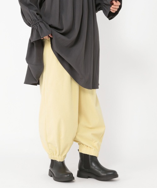 バルーンシルエットがポイント☆ 着回しの効く裾ゴムパンツ ーーー 【素材】 秋冬らしいコーデュロイ素材を使用。 軽くてシワになりにくいのが特徴です。 【デザイン】 裾にゴムの入ったバルーンシルエットのパンツ。 裾のリブは締め付けすぎず、程よくゆとりがある仕様◎ 目を惹く柔らかなカラーが新鮮で、スポーティ過ぎずナチュラルな印象でご着用いただけます♪ ウエストはイージーなゴム仕様+紐で調節可能なのも嬉しいポイント! 透け感 :やや透ける(アイボリー52で計測しています。) 伸縮性 :あり 生地の厚さ :普通 裏地 :なし ポケット :あり コーデュロイパンツ バルーンパンツ イージーパンツ ーーー 【スタイリング】 今の時期はニットやスウェット合わせがおすすめです♪ 暖かくなってきたら薄手のカットソーやブラウス合わせも◎