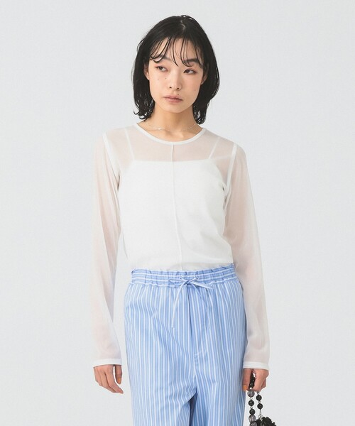 ワードローブに加えたい1着 ■デザイン 透け感のある柔らかな素材が心地よいロングスリーブTシャツ。 ミニマルなデザインながら、中央の接ぎが効いてレイヤードスタイルを引き立てます。 ベーシックで使いやすいホワイト・ブラックに、ニュアンスのあるブルーが、新色として加わりました。 ■コーディネート 1枚でトップス使いはもちろん、キャミワンピースのインナーや、 カーディガンの袖元からのぞかせるなどレイヤードアイテムとしてもお使いいただけます。 ■サイズ 落ち感があるのでボディライン出にくいですが、やや細身。 ■素材 繊細な素材なので引っ掛けにご注意ください。 ■ケア方法 手洗い可 (詳細は商品についている洗濯表示タグをご覧ください。) 【WHITE】Model:H161 B77 W58 H86 Size:ONE SIZE 【BLACK・BLUE】Model:H168 B81 W60 H89 Size:ONE SIZE ※光の当たり具合やパソコンなどの閲覧環境によって、実際の色味と異なって見える場合がございます。予めご了承ください。 ※商品の色味は商品単体で撮影した画像をご参照ください。