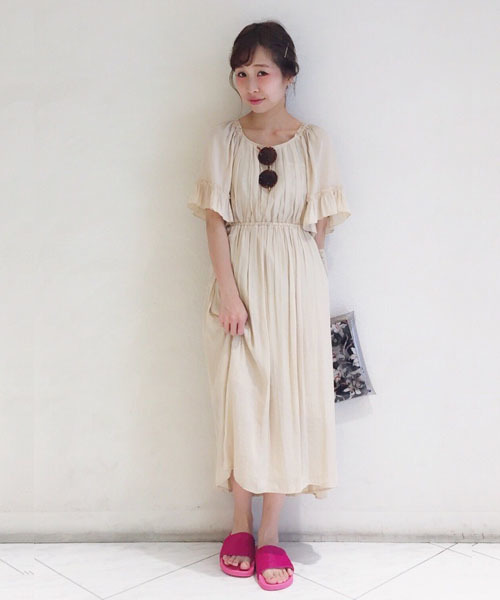 CRXデシンタックワンピース☆ ふんわり広がるドレープとロングの着丈が女性らしい印象のワンピース。 ウエストに切り替えと裾にはフリルを加えた事でアクセントになっています。 襟にはゴムが入っており、肩までおろしてオフショルダーとしても着ていただけます。 一枚で大人フェミニンスタイルに着こなしたり、敢えてパンツを重ねたスタイルもおススメです◎ ※スタッフ着用画像は色味が若干異なります。カラーは詳細画像をご確認ください。 ※着用、お取り扱いの際は商品についておりますアテンションタグ、洗濯ネームを必ずご確認ください。 店舗にお問い合わせの際は、全国のAnother Edition店舗まで 下記の品名/品番をお申し付け下さい。 品名:CRX デシン タック OP 品番:56262992648