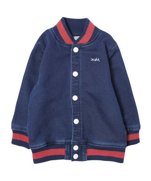 カレッジテイスト溢れるラインリブを使ったスタジアムジャンパー。MODEL 98cm 2T着用