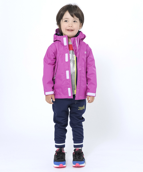 防水仕様のソフトシェルジャケット。フードにはリフレクターロゴプリント、後ろ身頃にはリフレクターワッペンが付きで安全面も◎ フリースやインナーダウンなどのミドルレイヤーを着れば真冬でも着ることのできるアイテム!! MODEL 98cm 2T着用
