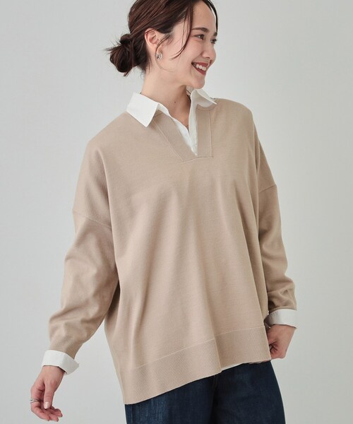 【デザイン】 スリット入りの首元(カフタン)が特徴的な大人っぽいデザインのニット。 肌当たりの良い滑らかな編地を使い、 身体のラインを拾いにくいコクーンシルエットで体型をきれいに見せることにこだわりました。 【スタイリング】 気温が低い時期にはタートルネックなど首元をカバーするインナーをレイヤードするとバランスよく着ていただけます。 暖かくなってきたら、クルーネックのロンTやタンクトップを合わせた着こなしがおすすめ。 ヒップをきれいにカバーする着丈なので テーパード細身のパンツと合わせるとバランスが良くメリハリある着こなしに。 ナロースカートを合わせてほんのり女性らしく。 サテンなどの落ち感のある素材のプリーツスカートなどをあわせるとフェミニンな雰囲気になりおすすめです。 【素材】 もちもちっとしたタッチが心地よいニット素材を使用しています。 ※照明の関係により、実際よりも色味が違って見える場合があります。また、パソコン・スマートフォンなどの環境により、若干製品と画像のカラーが異なる場合もございます。 モデル情報:身長163cm B81 W59 H88 着用サイズ:00(FREE) 店舗へのお問い合わせ商品番号:C62-12013 ●製品寸法: 00(FREE):着丈65cm B138cm 袖丈38cm 肩幅69cm 備考: