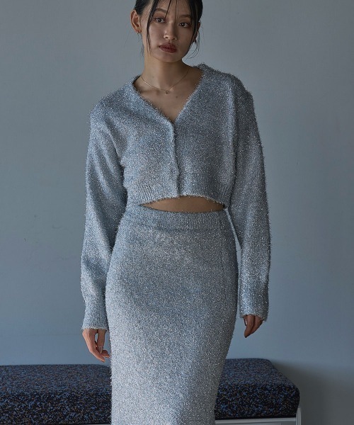 ラメ糸を編み込んだニットカーディガン。 セットアップでLAME KNIT SKIRTもご用意がございます。 もちっとした質感で伸縮性があり柔らかめ。 前ボタンで短丈なデザイン。短丈が苦手な方にはインナーを通常丈のものを選んでも。短丈のバランスで脚を長く見せてくれます。 カーディガンですが春先なら1枚でトップス使いも。 セットアップで着ていただくのはもちろん、カジュアルにデニムやコットン系のパンツやスカートと合わせるのもおすすめです。 ゆったりとしたシルエットで軽くて着心地も楽ちんです。 ※こちらのアイテムは数量限定販売ですので売り切れ次第販売終了となります。 [着用時期]10〜4月(約18℃以下) [透け感]なし [生地の厚み]中肉 [ストレッチ]あり [生地のやわらかさ]シャリ感 [生地の特徴]毛足の短いシャギー系ニットをラメ糸と織り込んだニット [落ち感]若干あり [着用ジワ]なりにくい [身長]全ての方に(身長によって着丈が変わります) ※感じ方には個人差がございますので気になる部分がありましたらお気軽にお問い合わせください