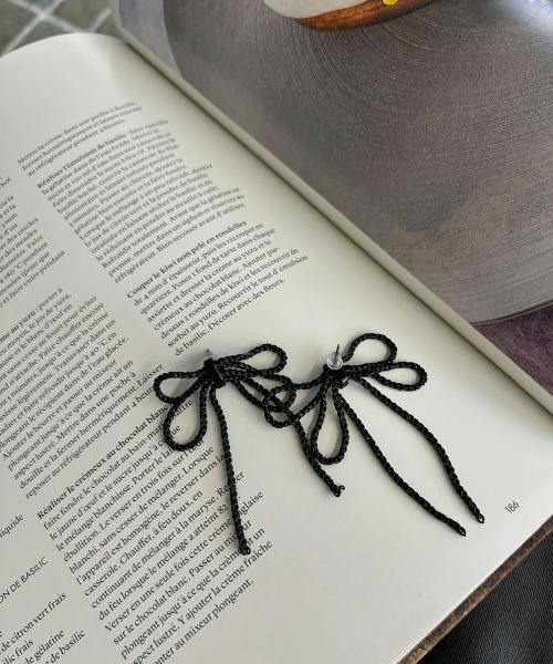 ふたつのリボンが重なったデザインにピアス。イヤリングでも人気だったデザインが今回はピアスに。少し光沢ある素材。甘くなりがちなリボンもブラックにすることでシックに。揺れ感もとても魅力的です。